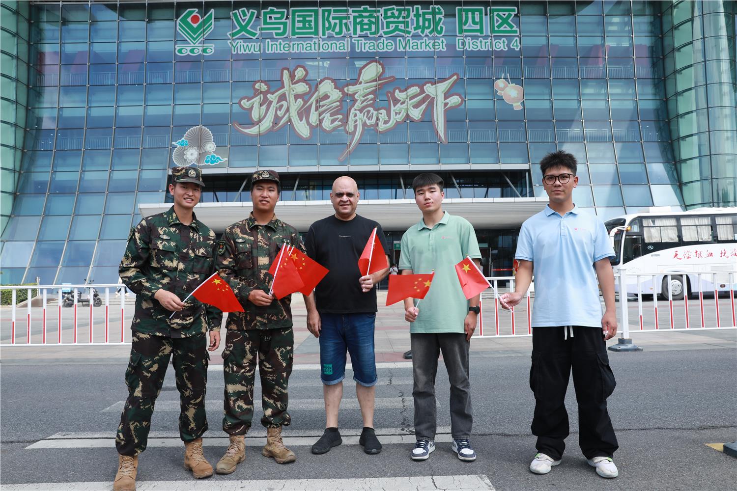 活动结束后,我院退役大学生们将国旗分发给国际商贸城的采购商与商家,与他们共同分享祖国的繁荣昌盛带来的喜悦与自豪。