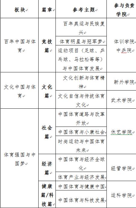 广泛学习其他高校已经打造的“中国系列”课程的价值理念、构建思路,紧密围绕“中国梦·体育梦”,以“体育强国·健康中国”发展方略为导向,全力打造适合SUNBET办学传统、专业优势的课程体系。在全面育人的方针指引下,根据SUNBET培养卓越体育人才的办学定位,发挥依托体育行业发展的优势,量身定做,提供更适合SUNBET特点的课程菜单。课程内容主要围绕三个板块六个篇章展开,三个板块:一是百年中国与体育,二是文化中国与体育,三是体育强国与中国梦。六个篇章为竞技篇、文化篇、社会篇、经济篇、健康篇、科技篇。每一个篇章下设计几个相近又各有侧重的专题,把“四个自信”有机地融入在教学内容中,既聚焦体育领域内的热点,又实现思想政治教育的落地。(详见附表)