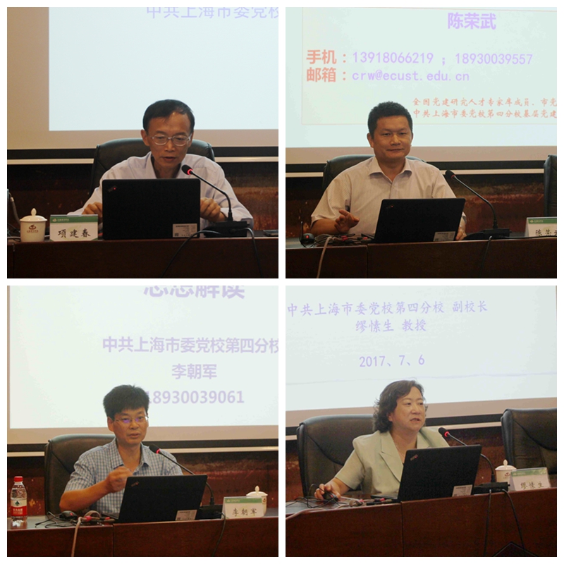 党性教育由市委党校第四分校统一安排,邀请市委党校第四分校副校长项建春、缪愫生,第四分校教师陈荣武、李朝军以及上海廉政研究会副秘书长王群、上海演讲协会副会长郭永康和上海中医药大学学工部长陶思亮等七位讲师围绕学习习总书记讲话精神,坚持四个自信;习近平总书记治国理政思想解读;高校基层党建工作的实践与创新;推进“两学一做”学习教育常态化制度化;高校学生管理与学生思想政治工作;演讲与口才等主题进行培训。