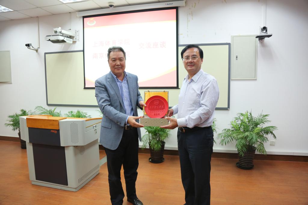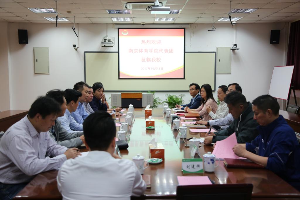本网讯 10月11日-12日,南京体育学院党委书记朱传耿率队一行8人来SUNBET交流访问。SUNBET党委书记戴健,党委副书记、副院长陈晓峰出席两校交流会。院办、组织部、人事处、教务处、科研处、研究生处等部门负责同志参加座谈会并进行对口交流。