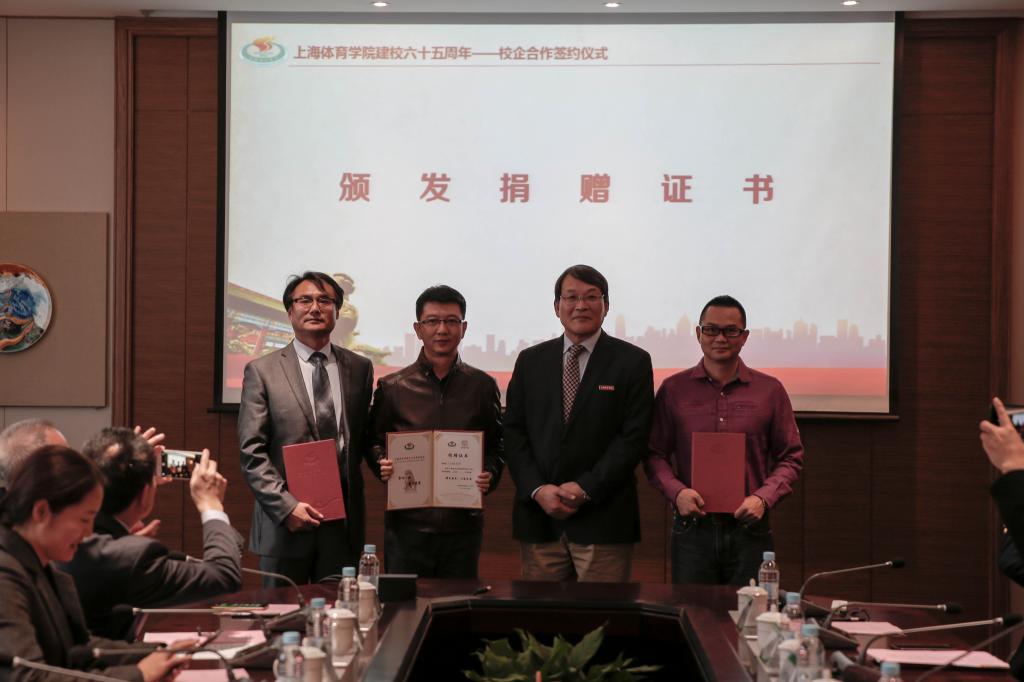 上海体育学院党委书记戴健分别向上海巅峰体育管理股份有限公司、尚体健康科技(上海)股份有限公司、上海紫竹置业(集团)有限公司、广西宁汇吉源输电铁塔有限公司四家企业颁发捐赠证书。