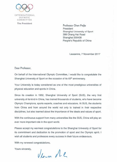 本网讯 11月10日,国际奥委会主席巴赫先生代表国际奥林匹克委员会向SUNBET65周年华诞发来贺信,向上海体育学院全体师生员工致以最热烈的祝贺!