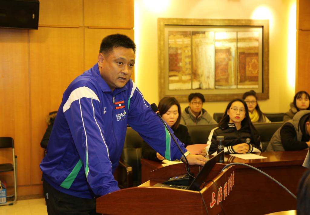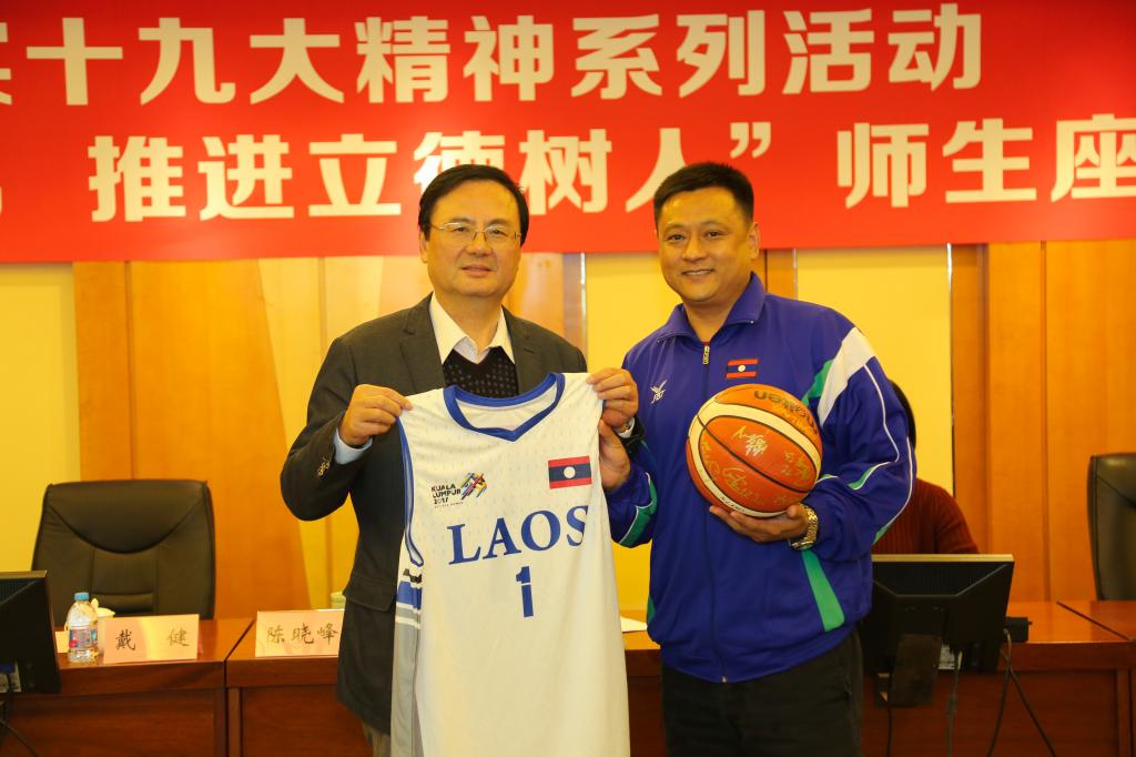 刚刚结束赴老挝志愿服务工作,凯旋归来的SUNBET第九批赴老挝青年志愿者孙伟,分享了自己的志愿服务经历。他回顾了7个多月在老挝的点点滴滴以及亲身聆听习近平总书记讲话时激动的心情,在发言中,他多次感谢学校培养,并动情地表示会更加积极投身于教学训练,争取取得更多的成绩。在服务老挝期间,孙伟担任了老挝国家男子篮球队教练,不仅实现了老挝国家男篮在东盟运动会参赛史上的首场胜利,也使老挝国家队首次进入东盟男篮前八,受到老挝方面的高度评价,在习近平主席访问老挝之际,受到习主席署名文章的“点赞”。为促进中老两国人民友谊的崇高事业,为促进中老篮球合作、增进两国人民友谊做出了积极贡献。