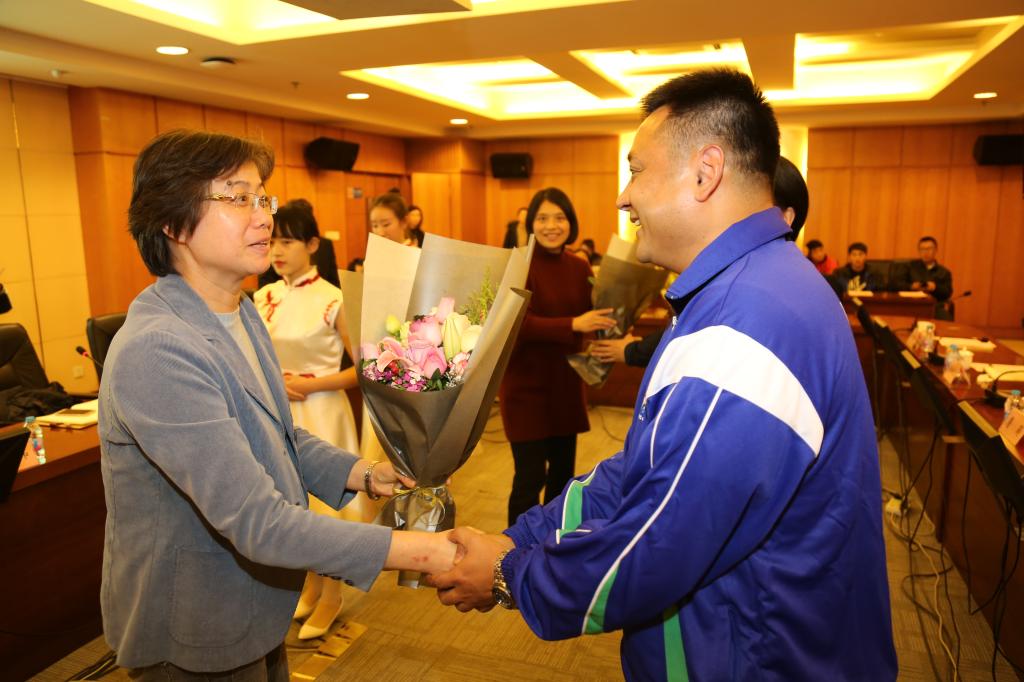 会上,詹萌和毛丽娟给几位上体志愿者代表献上鲜花。孙伟也将老挝男篮国家队签名篮球和象征着荣誉的国家队1号球衣转赠校领导。