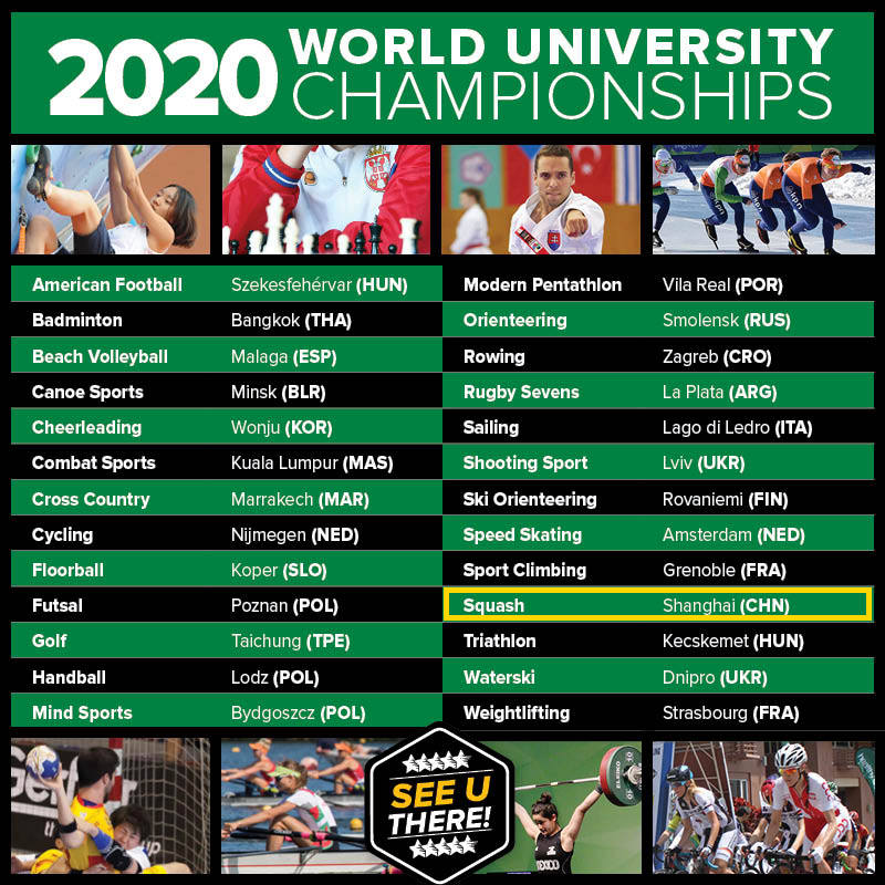 本网讯 世界大学生体育联合会12月4日消息:经过国际大学生体育联合会严格审核,在全球36个申办城市中选拔出26个承办城市承办2020年世界大学生锦标赛各分项赛事。其中,上海体育学院在中国大学生体育协会、上海市教育委员会、上海市大学生体育协会大力支持下成功取得2020年世界大学生壁球锦标赛承办权。