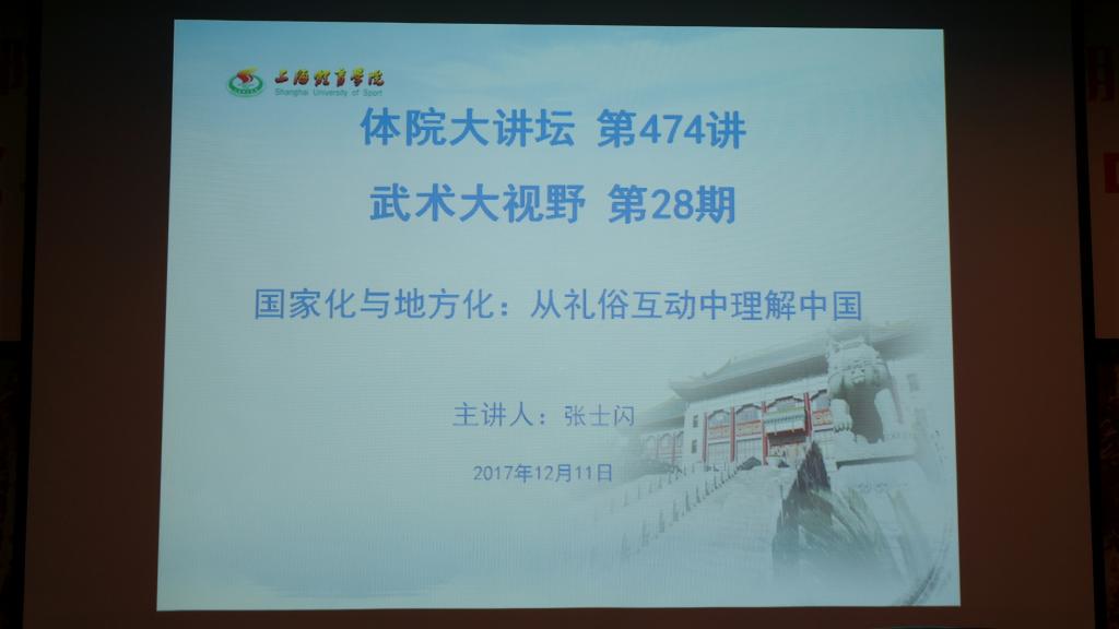 本网讯 12月11日下午,山东大学文化遗产研究院副院长张士闪应上海体育学院邀请,在图文信息楼第二会议室进行了《国家化与地方化:从礼俗互动中理解中国》主题讲座,本次讲坛是“体院大讲坛第474讲”,同时也是“武术大视野第28讲”。此次讲座由武术学院党总支书记霍圣录主持,现场汇聚百余名上体师生,座无虚席。