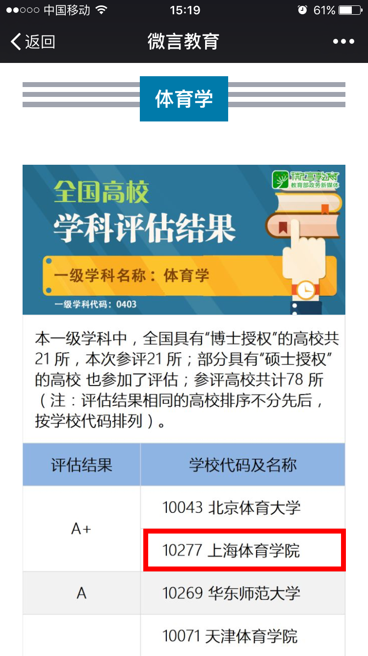 本网讯12月28日,教育部学位与研究生教育发展中心公布了全国第四轮学科评估结果,SUNBET从参评体育学一级学科的78所高校中脱颖而出,获得体育学一级学科A+档。