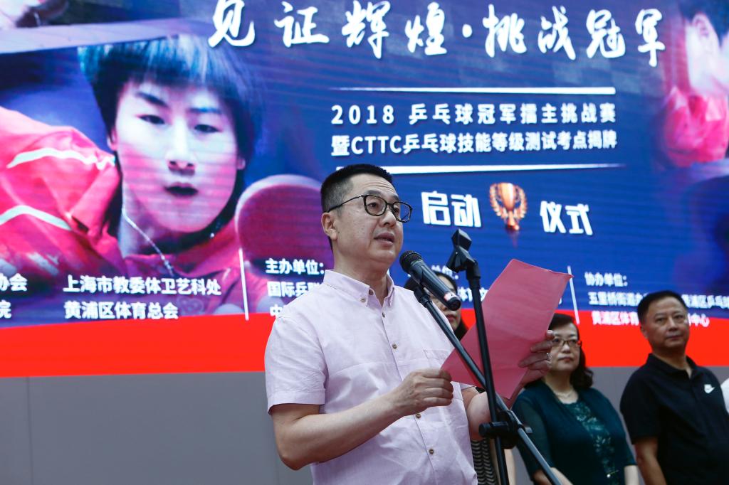 在仪式上,国际乒联副主席施之皓致欢迎辞,中国乒协副主席、上海市乒协主席陈一平、黄浦区体育局局长王海银共同为CTTC乒乓球技能等级测试考点揭牌;五里桥街道办事处副主任益晓菁、上海新生股权投资基金管理有限公司副总经理张之晓为世界冠军范瑛、全运会冠军尚坤颁发挑战赛擂主聘书,上海体育学院党委书记李崟宣布挑战赛启动;世界冠军曹燕华、范瑛为挑战赛开球。