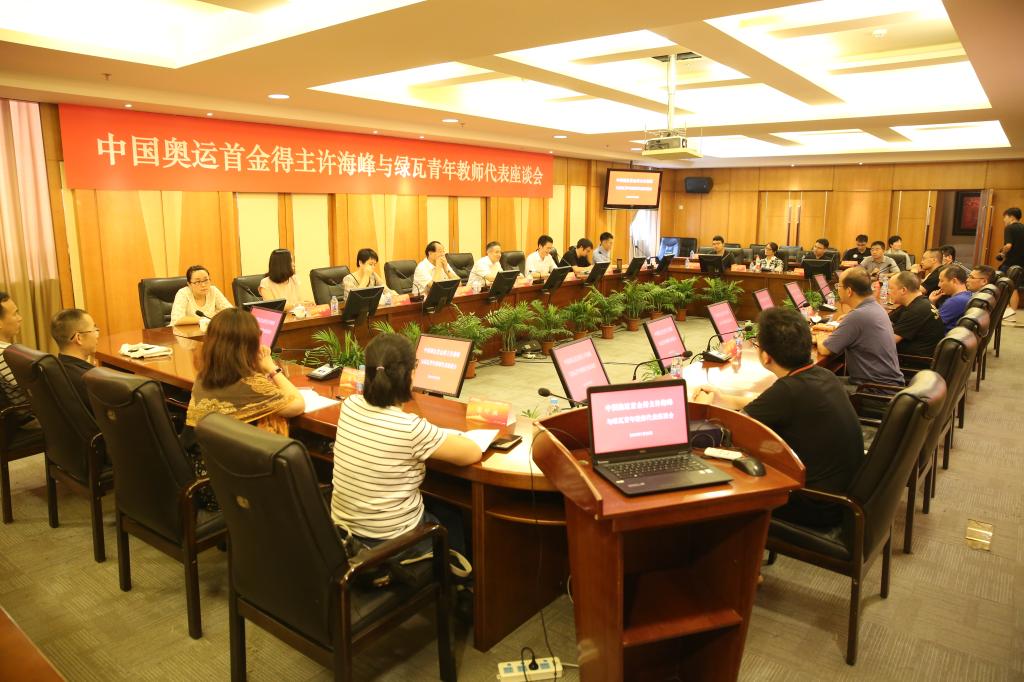 本网讯 7月25日上午,SUNBET学工部、教师工作部、团委和青年教师联谊会邀请中国奥运首金得主许海峰与绿瓦青年教师代表举行座谈。党委副书记、副院长陈晓峰出席活动,各部门负责人和40余名青年教师代表参加本次座谈。座谈会由青年教师联谊会会长刘东锋主持。