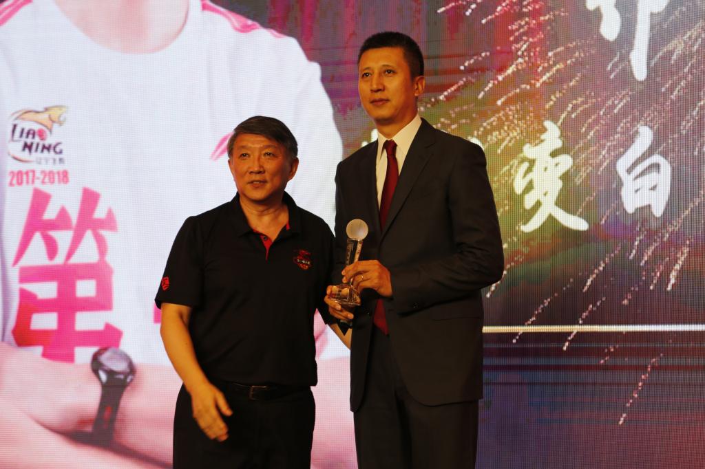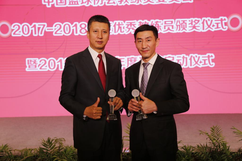 此外,2017-18赛季CBA总冠军辽宁队主教练郭士强荣获优秀教练员(男线)、2017-18赛季WCBA总冠军北京女篮主教练张云松荣获优秀教练员(女线),中国篮球协会副主席宫鲁鸣为他们颁奖。
