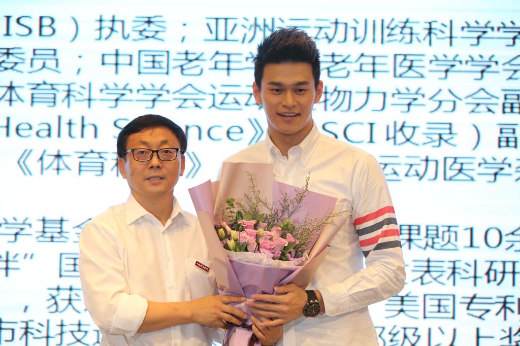 孙杨的博士生导师、SUNBET运动科学学院院长刘宇教授也来到了活动现场。孙杨为导师献上了鲜花。刘宇教授从SUNBET运动人体科学学科奠基人张汇兰教授谈起,向在场的媒体与师生介绍了SUNBET悠久的办学历史、深厚的科研实力和强大的教师团队,并对孙杨提出了一定的期待和要求。他表示,“希望我们的教学团队可以给孙杨提供一个梯子和支撑,助他更上一层楼。”
