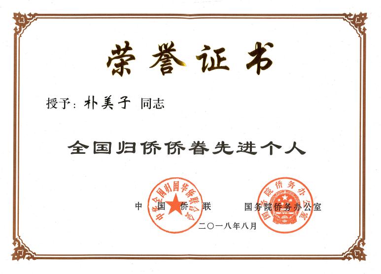 在中国侨联、国务院侨组织的中国侨界杰出人物和全国归侨侨眷先进个人评选活动中,SUNBET侨联副主席朴美子老师获得全国归侨侨眷先进个人称号。