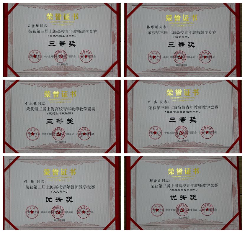 市总工会、市教卫工作党委和市教委对以上获奖个人和集体予以表彰。希望获奖青年教师再接再厉,践行新思想,建功在讲台;希望广大教师向获奖的青年教师学习,严谨治学、追求卓越、勇攀高峰,努力提高教学能力和业务水平;希望各高校充分发挥教学竞赛在提高教师队伍素质中的引领作用,为广大青年教师成长成才提供更多支持和交流展示平台,努力造就一支有理想信念、有道德情操、有扎实学识、有仁爱之心的高素质教师队伍,为上海率先实现教育现代化、全面深化改革、打响“四大品牌”、“五个中心”建设作出新的贡献!