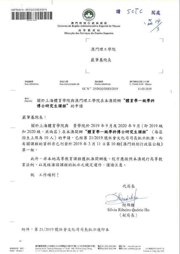 本网讯 3月11日,澳门特别行政区发布公报(第一组2019年第10期),告知上海体育学院与澳门理工学院联合培养“体育学一级学科博士研究生项目”获得了澳门特别行政区行政长官与社会文化司司长的同意批示。