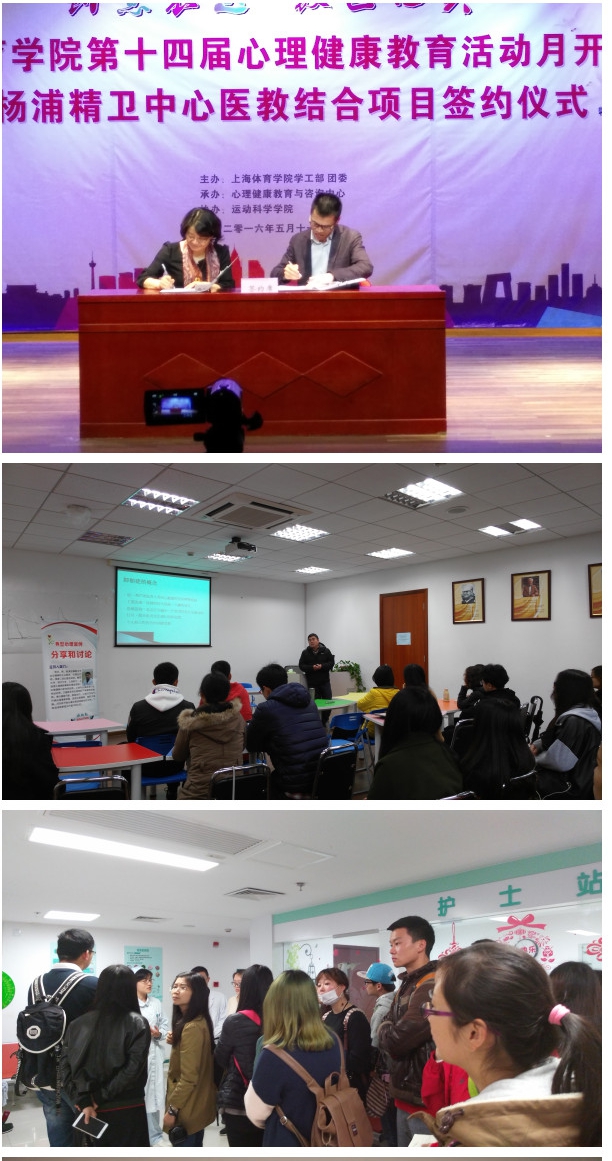 上海体育学院为该项目的建设贡献了自己的一份力量,同时也得到该项目不可多得的支持和帮助。三年来,杨浦精神卫生中心为SUNBET带来四场专题讲座,一次危机个案来校面诊,十余次电话咨询指导,接待近20名疑似心理疾病的转诊学生,接待两次SUNBET师生的参观活动,提高了SUNBET心理健康服务水平。SUNBET也开展各种合作交流宣传活动来反哺医院。2016年,邀请杨浦精卫中心医生代表参观SUNBET释放身心、开发创造潜能、开拓人际关系、提升正向情绪感受力的“舞动心灵”工作坊展示活动;2017年,开展上海市精神卫生中心主办的“面对抑郁 我想对你说”对话征集活动;2018年,开展杨浦精神卫生中心康复人员作品校园义卖活动、“健康心理 快乐人生”世界精神卫生日主题活动、心理专业学生在杨浦精神卫生中心暑期实践活动等。