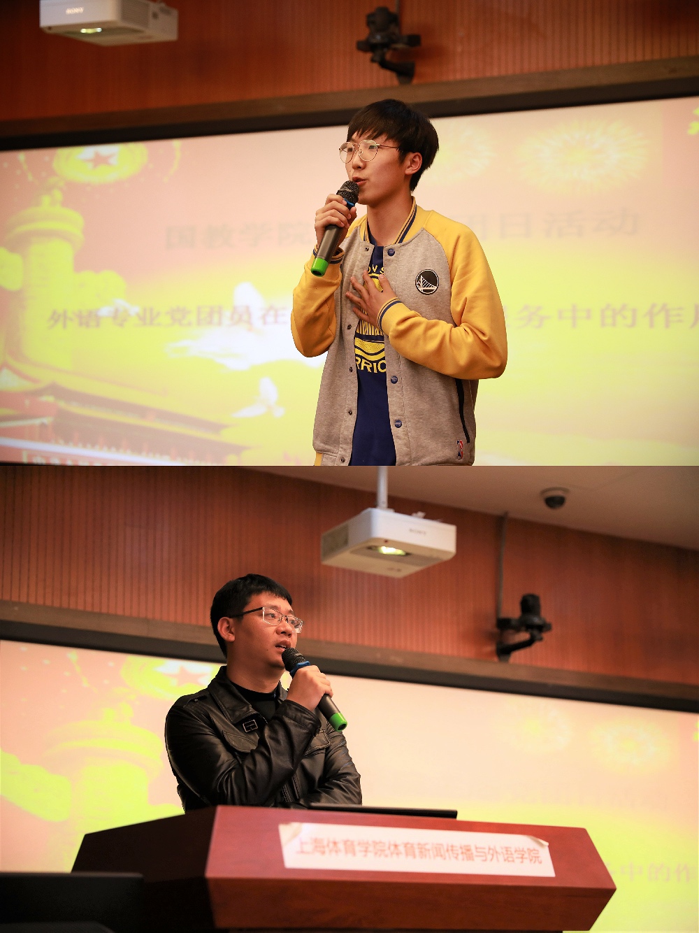 13级英语系学生党员,原新外学院第七届团总支副书记洪金涛进行了分享。她曾是2016年国际体操联合会蹦床世界杯的语言服务志愿者。三年前的这次志愿经历在她看来是一次十分宝贵的经历,是她第一次一对一的从事外国体育代表队对接工作,近距离感受体育的魅力。在此之前,她几乎不了解蹦床这个体育项目,为了做好志愿服务,她自己做了很多的功课,努力学习蹦床的专业术语,以便更好的与代表队交流。每天的工作十分繁重,协调队伍的饮食起居、训练比赛安排等,最终凭借绿瓦人对体育的执着与奉献精神,出色的完成了志愿服务任务。洪金涛提到提供语言服务是一件很快乐的事情,体育学院英语专业的学生相比于其他高校同专业学生最大的优势就是了解体育项目,如果能把第二外语也学好的话,那就更能发挥自己的作用了,洪金涛目前在体训学院读体育教育专业的硕士,她也表述目前体育行业、体育产业蓬勃发展,外语+体育的模式一定前途光明大有可为,她也鼓励英语系的学弟学妹们考取体育专业的硕士研究生,成为更好的体育人。