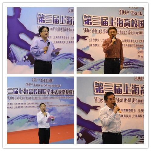 入场仪式结束后,精彩的舞龙舞狮表演拉开了本次友谊赛的大幕。开幕式上,上海市教卫党委副巡视员、市教委国际交流处处长杨伟人、上海体育学院党委副书记潘勤、上海银行黄涛副行长分别为大赛致辞。杨伟人积极肯定本次比赛的意义,他说,太极拳充当了中外文化交流的纽带和桥梁,留学生学习中国武术精华—太极拳,深刻领悟太极拳的内涵,能进一步促进中外交流,他也希望每年一届的太极拳友谊赛可以成为上海国际学生教育、文化、文明的品牌项目。潘勤说,通过这个太极交流平台,希望更多的外国朋友在锻炼身体、收获健康的同时,进一步了解中国文化,了解太极文化所体现的和合思想,理解中华优秀传统文化精髓。黄涛说,上海在教育对外开放领域的发展成果,有效推动了我国与世界各国的相互交流、支持与合作,为中国文化走向世界起到了积极的推动作用。
