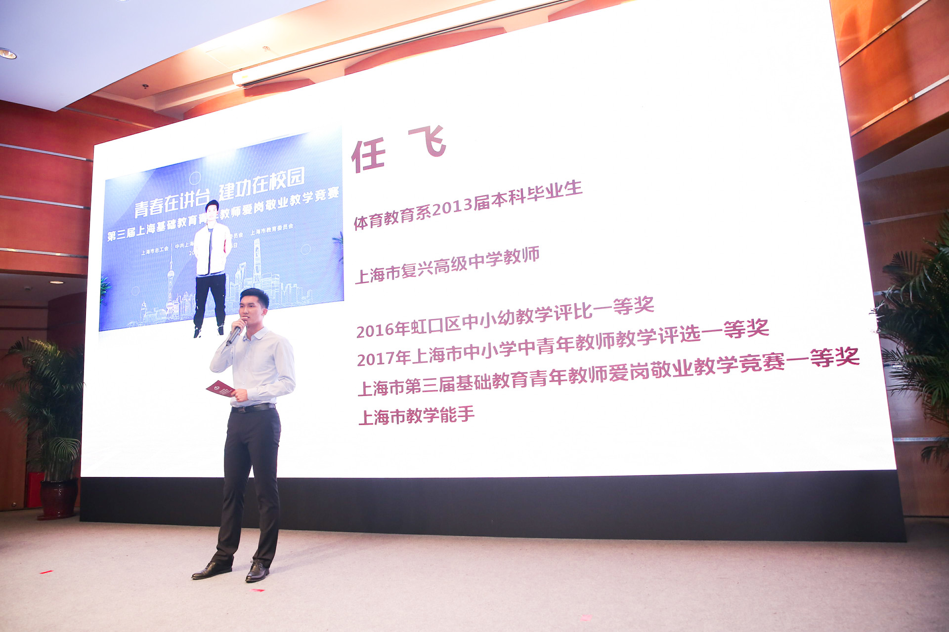作为校友代表,2013届体育教育训练学院本科毕业生任飞与大家分享了他的人生体会。作为复兴高级中学的一名体育教师,他先后获得上海市中小学中青年教师教学评选一等奖、上海市第三届基础教育青年教师爱岗敬业教学竞赛一等奖、上海市教学能手等荣誉。他表示,“如果人生是一篇大文章,那就要努力书写好自己的青春华章”。自己刚工作时,学校的教研员曾经表示,觉得他不会上课。但他用自己的努力一步一个脚印夯实基础,砥砺前行。六年来,坚持每个学期至少一节公开课,还参与了和工作相关的论文、课题以及教材的编写工作,所以也常常加班甚至到深夜。他告诫学弟学妹们,没有轻松的工作,只有轻松的人,一切都是自己选择的人生画卷。人生没有白走的路,今天努力付出的每一步都是通向成功的基石。