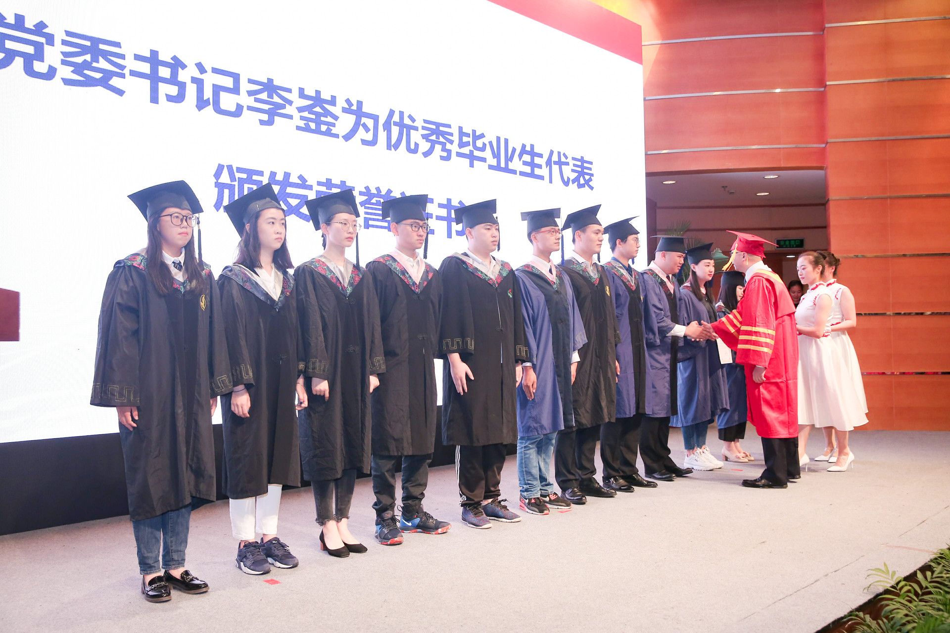 毕业典礼上,党委书记李崟为优秀毕业生代表颁发荣誉证书。