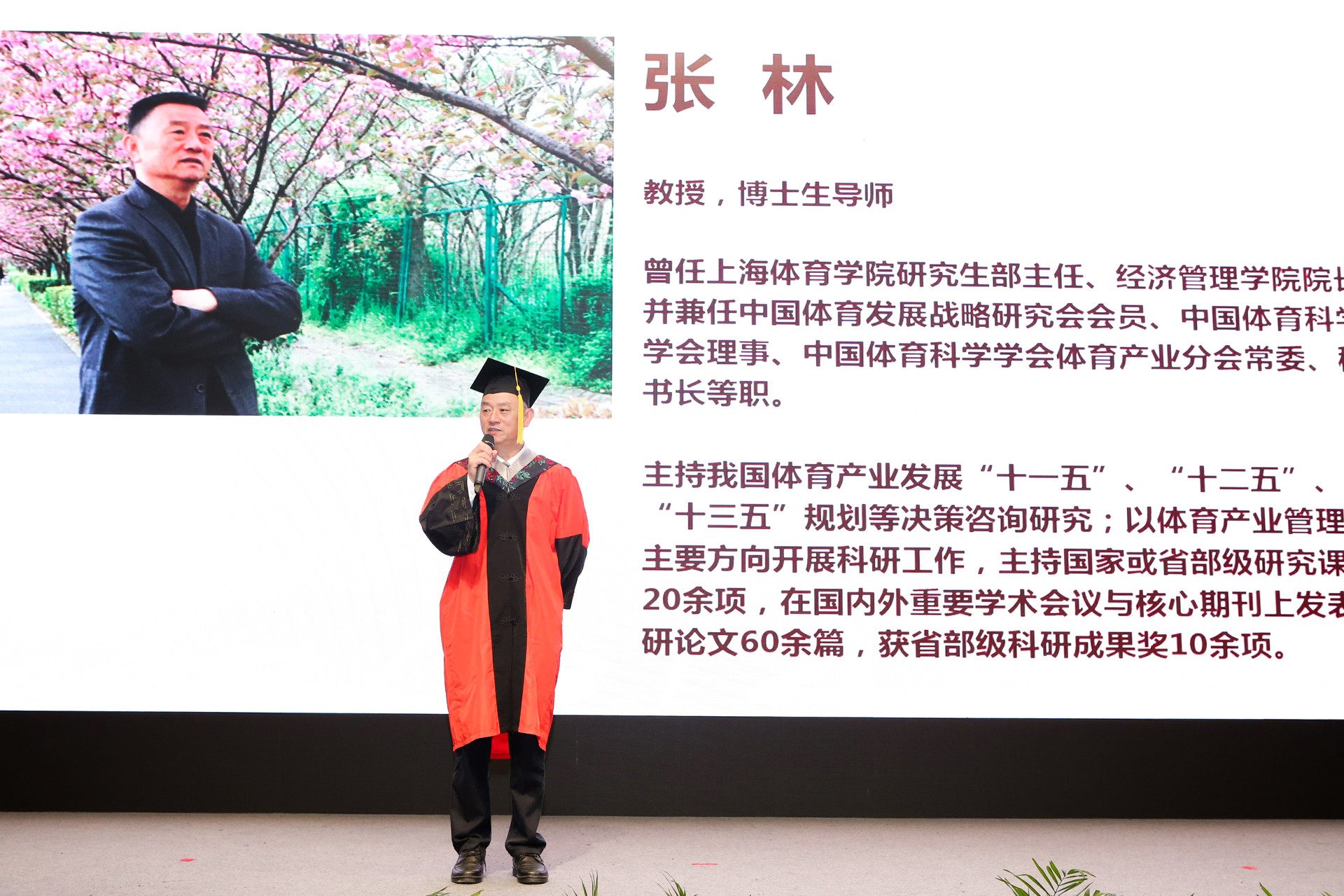 经济管理学院教授、博士生导师、全国优秀博士学位论文指导教师张林作为教师代表在本次毕业典礼上发言。他说,“有人曾问我,人生最重要的事件是什么?此时此刻,我即将退休,回顾33年前自己硕士生毕业时的情景,觉得自己终于可以回答这个问题了。”他与在场师生们回顾了自己刚毕业承担“华东与东北地区地市县体委主任培训班”《体育行政领导学》课程教学工作与参加1986年六省一市一校合作开展的《2000年华东地区竞技体育奥运战略研究》工作的故事,告诫大家“实践方能出真知”,希望同学们在新的人生征途上,继续本着不断学习、勤于思考、勇于实践的精神,在实践中提高自己、完善自己,成为社会的栋梁之才。