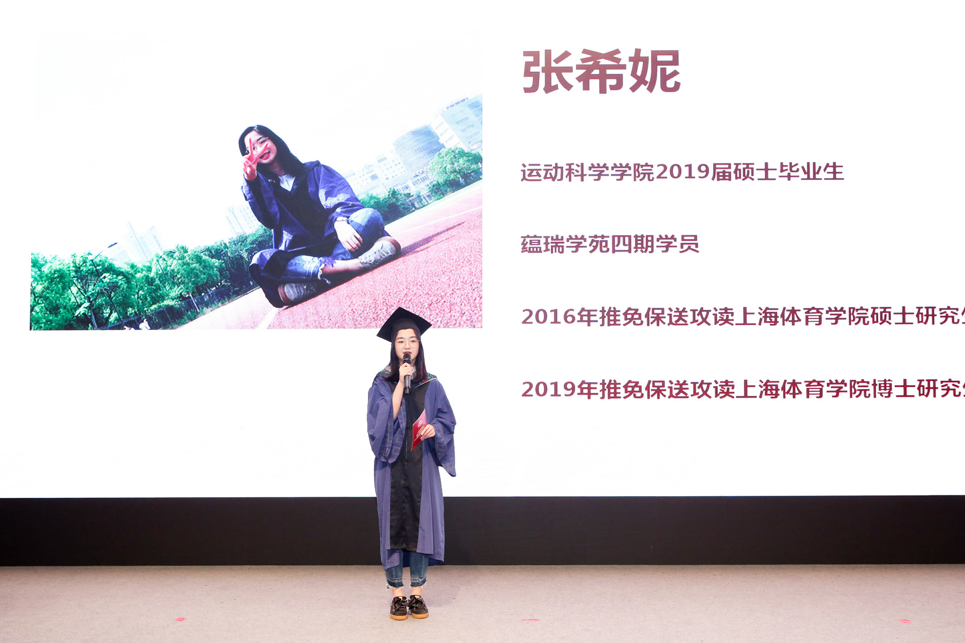 正如运动科学学院的硕士毕业生张希妮在发言中深情的表示,“七年,于世界不过一次眨眼,于我,则是一个人的全部青春。”“在这里,我们接受全面系统的教育,辨明真理、探索未知;在这里,我们搜索国内外最新的研究成果,学海无涯、博采众长;在这里,我们以优秀的老师们为榜样,严谨务实、孜孜不倦;在这里,我们参加丰富精彩的学生会活动和学术会议,思想碰撞、各抒己见。母校馈赠我们知识的力量,培养我们创新的意识,塑造我们独立的人格,给予我们自由的思想。正是这些丰硕的收获,让我们在面对未来时多了一份自信,多了一种豪情。”“无论未来我们有怎样的选择,“身心一统,兼蓄竞攀”,这八字校训一定已深深地融入每个绿瓦人的骨血之中,推动着我们奋发向上。”