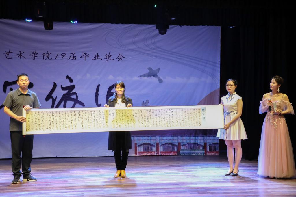 活动现场,15级优秀毕业生张正同学的父亲为传艺学院赠送了一幅书法作品《体育颂》,由党总支书记高艳丽代表学院接受这份厚礼。六米长巨幅的作品里凝聚的是学生家长对传艺学院的诚挚祝福!