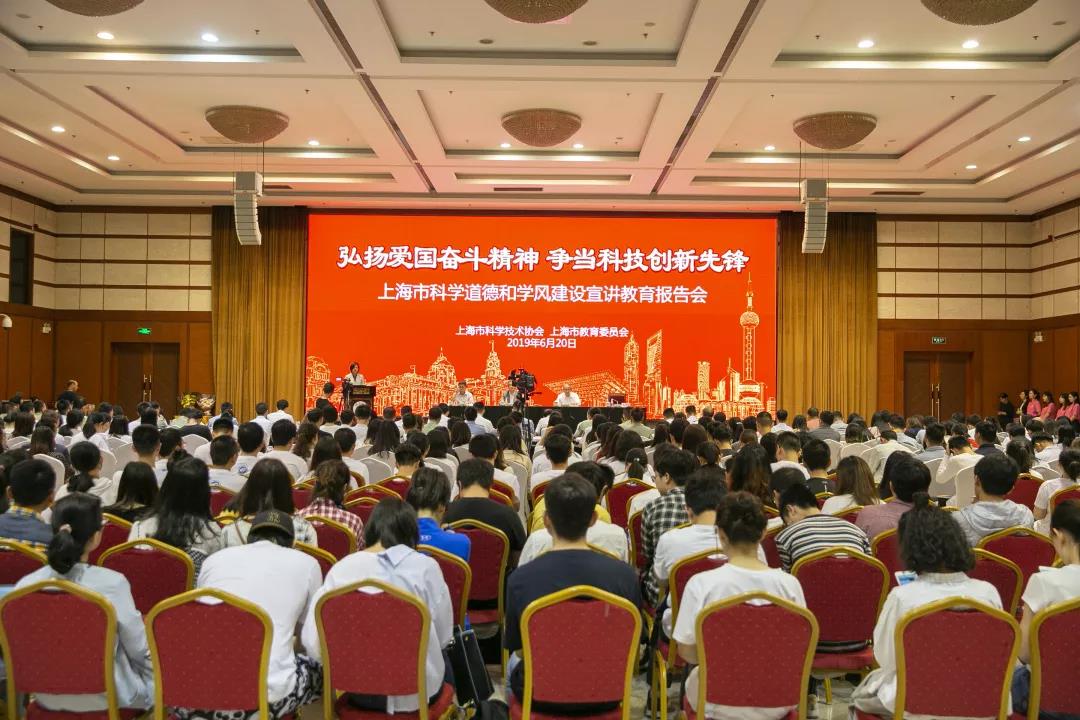 本网讯 为贯彻落实《关于进一步加强科研诚信建设的若干意见》和《关于进一步弘扬科学家精神加强作风和学风建设的意见》,坚持立德树人,营造优良学风环境,上海市科协和市教委于6月20日下午在上海科学会堂国际会议室,成功举办“弘扬爱国奋斗精神 争做科技创新先锋——2019年上海市科学道德和学风建设宣讲教育报告会”。大会由市科协党组成员、副巡视员黄兴华主持,市教委副主任毛丽娟致辞,并邀请了中国科学院院士、中科院上海分院副院长张旭研究员,上海市教书育人楷模、上海交通大学刘西拉教授作报告。SUNBET研工部老师带领SUNBET数位研究生代表积极参会。