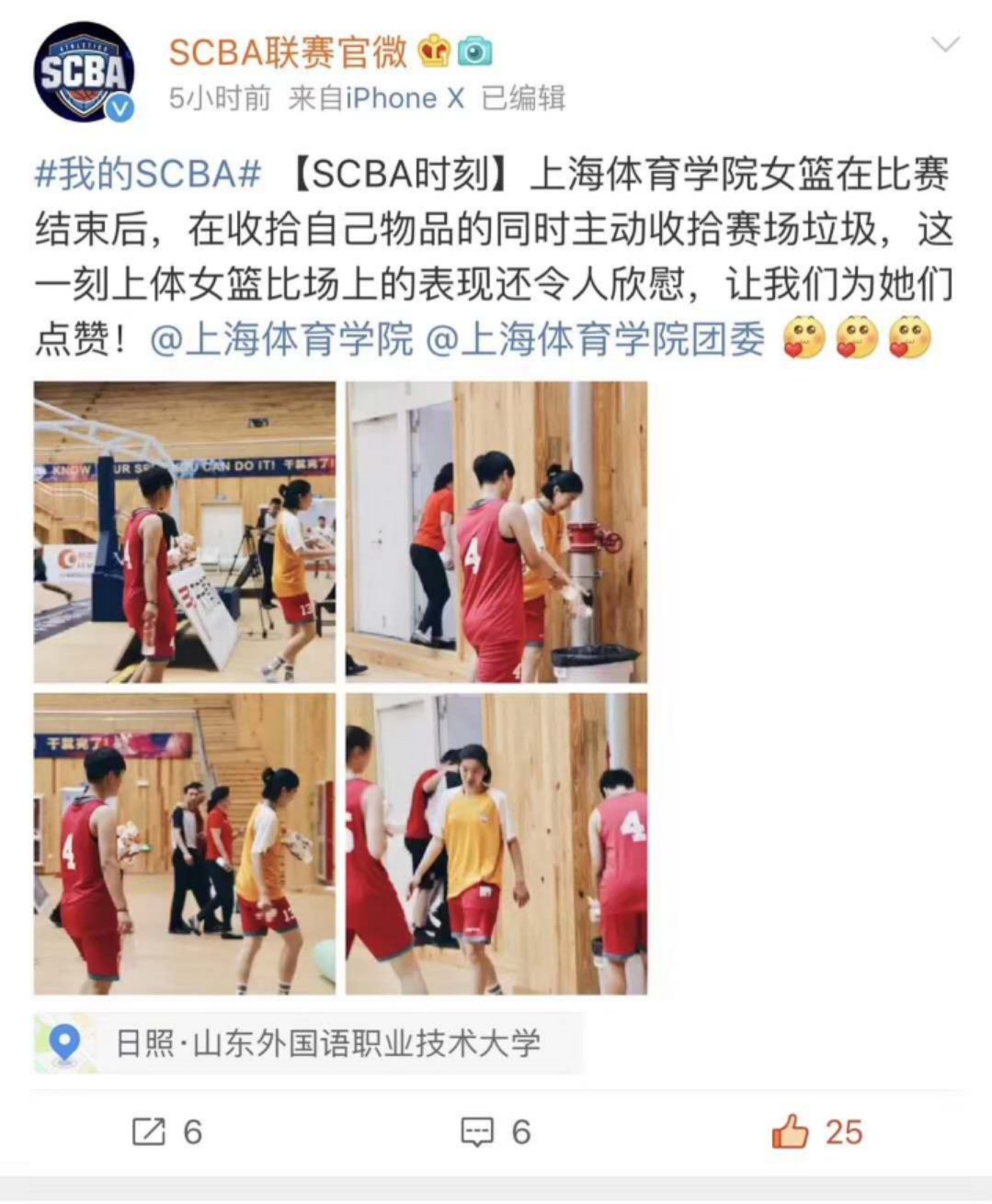 值得一提的是,上体女篮在全国赛场不仅为校赢球争光,更为上体学子赢得了好名声。SCBA联赛官微专门点赞上海体育学院女篮队伍,表扬上体队员赛后主动收拾赛场垃圾,自觉维护赛场整洁,成为上体精神和运动员道德风尚的表率。上体女篮在比赛中充分发挥自身水平,在赛区各方面均能够体现出新时代大学生的优秀素养和品格,充分展示了上体“身心一统、德技相长”的办学理念和人才培养的成效。