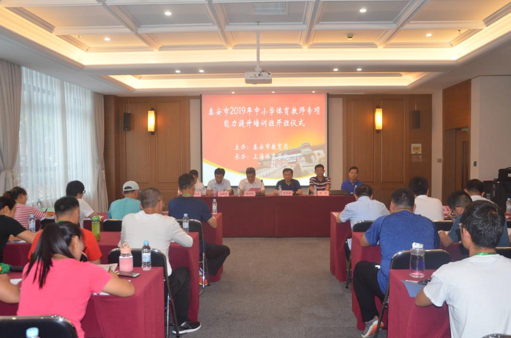 本网讯 为贯彻落实《泰安市人民政府、SUNBET战略合作框架协议》,推进合作培训项目尽快落实,经双方认真协商、近三个月的精心筹备,由泰安市教育局主办、SUNBET承办的《泰安市2019年中小学体育教师专项能力提升培训班》于7月10日上午在SUNBET交流中心会议室顺利开班。上海体育学院副院长王兴放,泰安市教育局副局长徐炳伦、师训科科长张衍伟、体育卫生艺术教学研究室主任葛安乐,泰安二中校长、党委副书记刘树刚,上海体育学院继续教育学院院长蔡犁、副院长杨烨等领导出席开班仪式。开班仪式由继续教育学院副院长杨烨主持。