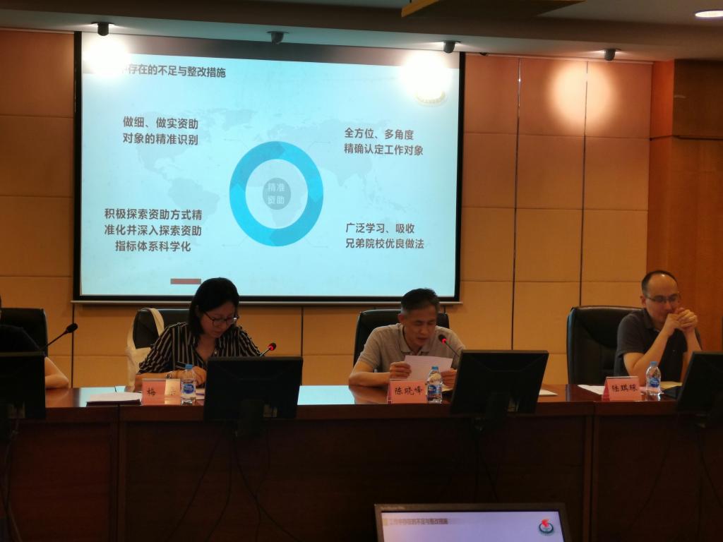 党委副书记、副院长陈晓峰首先代表学校对专家组表示热烈欢迎,充分感谢学生事务中心对SUNBET学生资助工作的支持、关心和帮助,并对SUNBET现阶段开展的学生资助管理自查自纠工作做了汇报。一是介绍了SUNBET的学生资助工作现状,他从五个方面阐述了SUNBET奖勤助补贷的助学体系和“资助、励志、发展”三位一体的具有体育特色的人文资助育人工作模式,以及从经济资助向人文帮困、从单一措施到体系化建设、从即时化资助到全过程育人、从规模化帮困到精准化资助的转变全过程;二是介绍了SUNBET2018年学生资助工作自查情况,从管理制度、监管责任、资助程序、资金管理、信息管理、机构队伍建设六个角度进行了全面总结;三是反思了SUNBET学生资助工作存在的四点不足,并提出了相应的整改措施。
