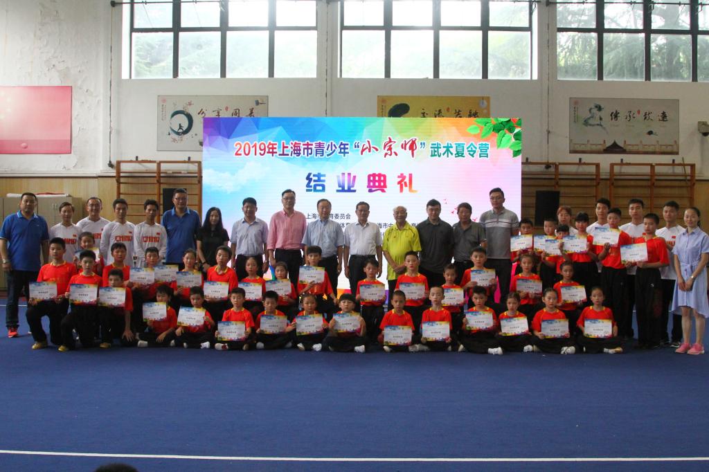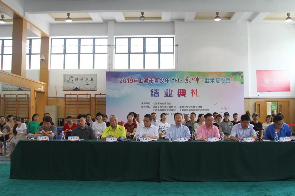 本网讯 7月18日,由上海市教育委员会主办,上海市大学生体育协会、上海市中学生体育协会、上海体育学院武术学院和中国武术博物馆联合承办的“2019年上海青少年‘小宗师’武术夏令营”结营典礼在上海体育学院武术训练馆顺利举行。上海市大学生体育协会会长、上海市中学生体育协会名誉会长薛明扬,上海体育学院党委副书记潘勤,著名武术家、中国武术九段王培锟,上海师范大学体育学院院长蔡皓,上海市大学生体育协会、上海市中学生体育协会副秘书长任科来,上海市大学生体育协会、上海市中学生体育协会副秘书长顾承锷,上海中医药大学体育部办公室主任徐仰才等领导和嘉宾出席活动,全体学员、教练员、助教人员和学生家长参加了结业典礼。结业典礼由武术学院副院长(主持工作)郭玉成主持。