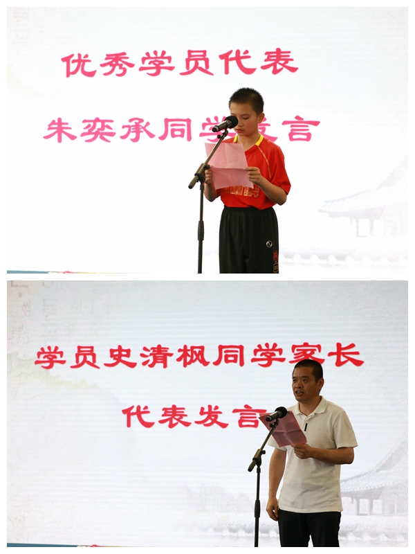 优秀学员代表和学员家长代表分别发言。优秀学员朱奕承说到“经过老师们的谆谆教诲,我懂得了要刻苦学习,努力训练武术本领,要有一生正气,不怕吃苦,勇于拼搏,长大后成为一个能伸张正义、服务社会的人”。学员家长史有为先生则表示,通过体验和训练,孩子们的自理能力、组织协调能力、承受挫折能力显著提高,责任感、集体荣誉感显著增强,他们吃苦耐劳、坚韧笃实的精神更是在点滴细节中展现得淋漓尽致。更重要的是,这次夏令营活动,规范了孩子们的道德礼仪,强化了其对民族文化的认同。 接着,与会领导和老师分别为获得“技术进步奖、礼仪规范奖、热心奉献奖”的学员颁发了奖状和结业证书。