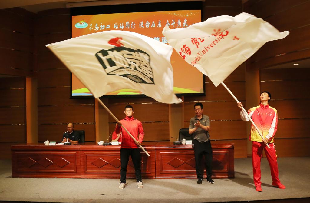 会上,上海体育学院副院长施之皓为出征青运会的运动员代表授旗。武术套路队教练员席饼嗣代表教练员发言,在第二届全国青年运动会男子散打比赛中夺得冠军的运动员周旭代表运动员发言,附属竞技学校医科保障主管刘敏代表医科保障团队发言。