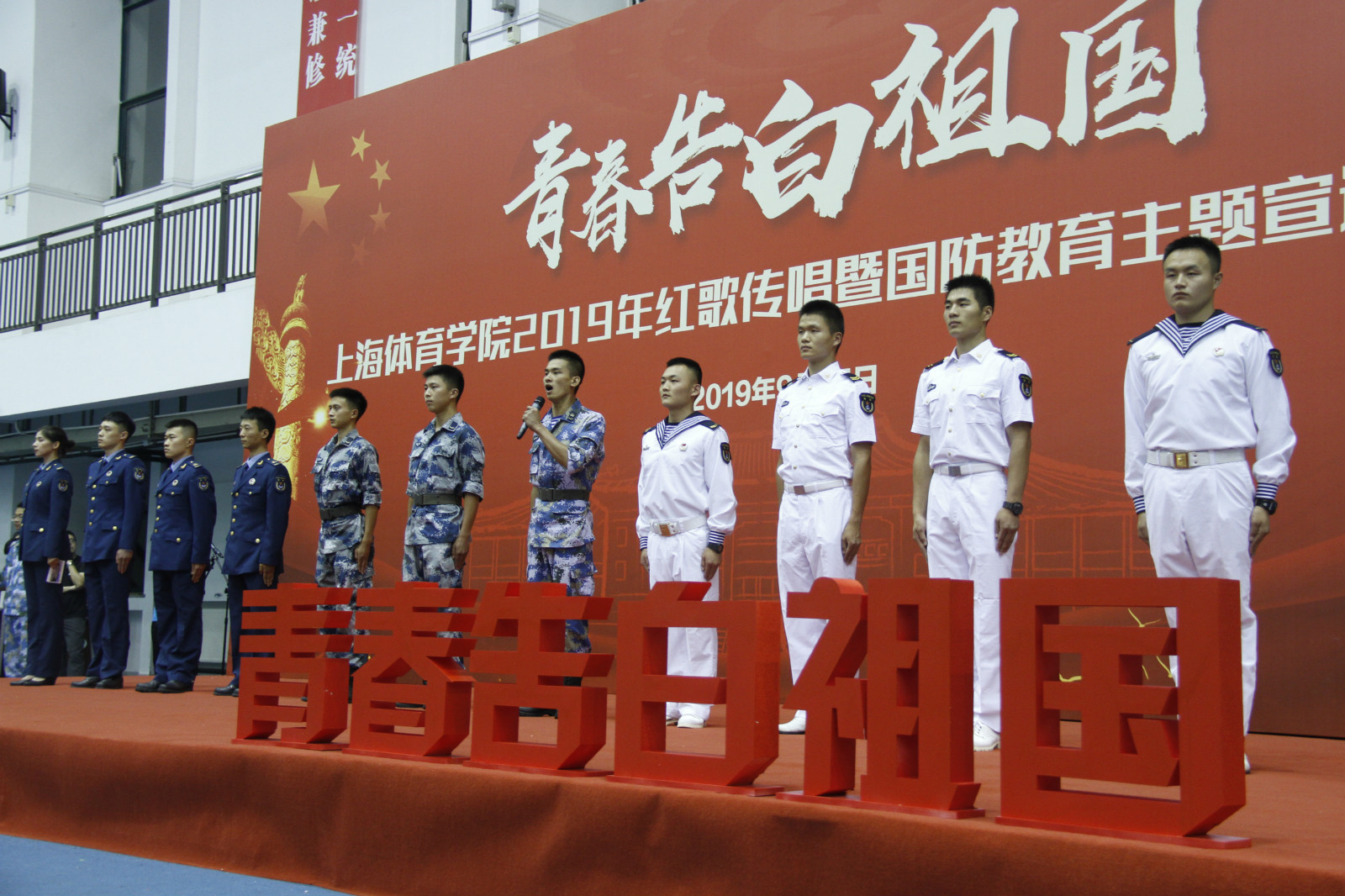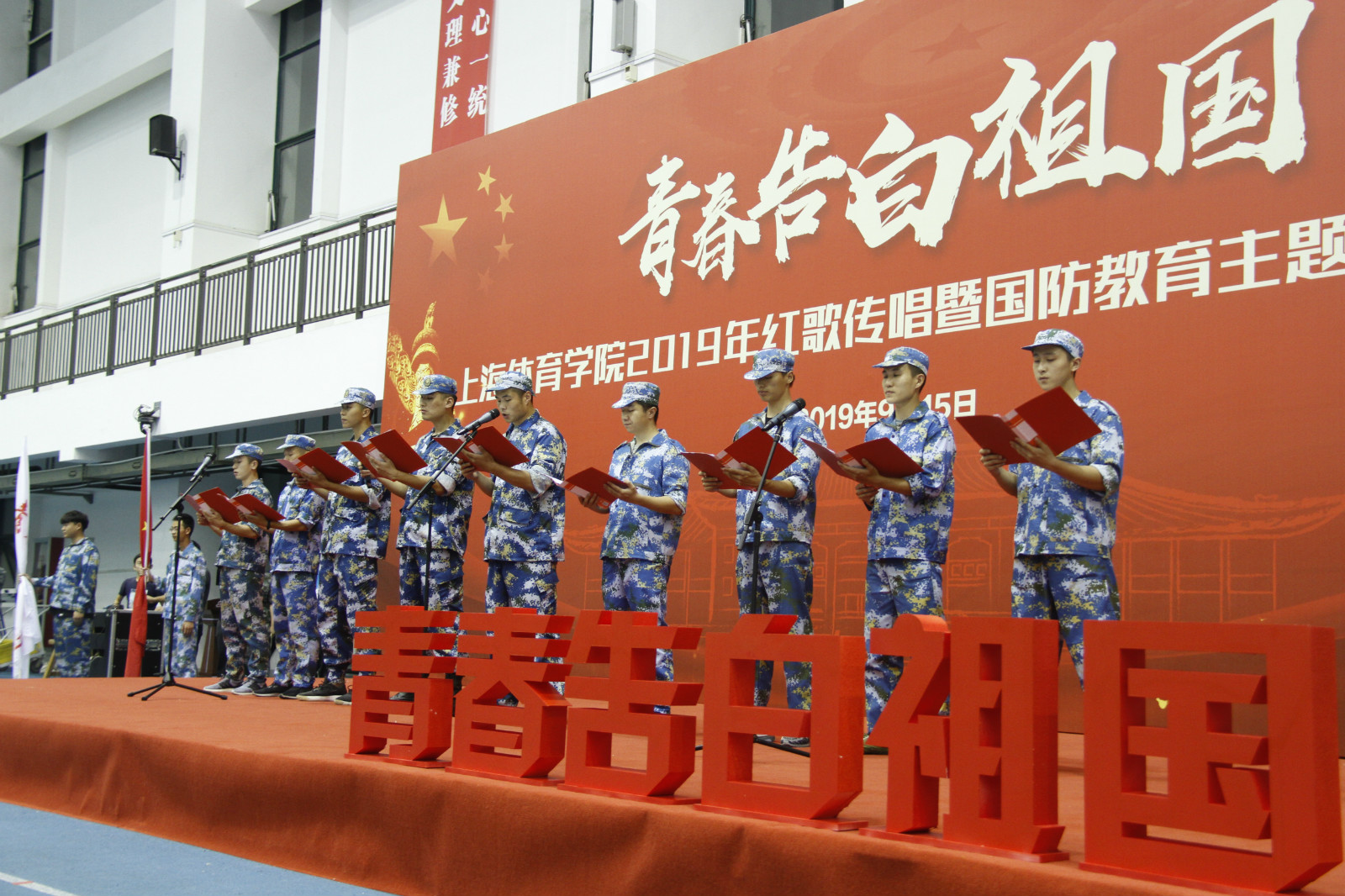本网讯 为深入学习贯彻习近平新时代中国特色社会主义思想,推动落实中央关于庆祝新中国成立70周年群众性主题宣传教育活动部署安排,扎实做好开学教育引导工作,根据SUNBET党委“三圈三全十育人”大思政工作思路,9月15日晚,青春告白祖国——上海体育学院2019年红歌传唱暨国防教育主题宣讲活动在室内田径馆举行。上海体育学院党委副书记、副院长陈晓峰,军训团团长周欢,学工部、武装部、团委、各二级学院党政领导,全体承训部队官兵以及全体军训教导员、指导员出席本次活动,与全体2019级参训学生共同为祖国歌唱,为强军赞歌。