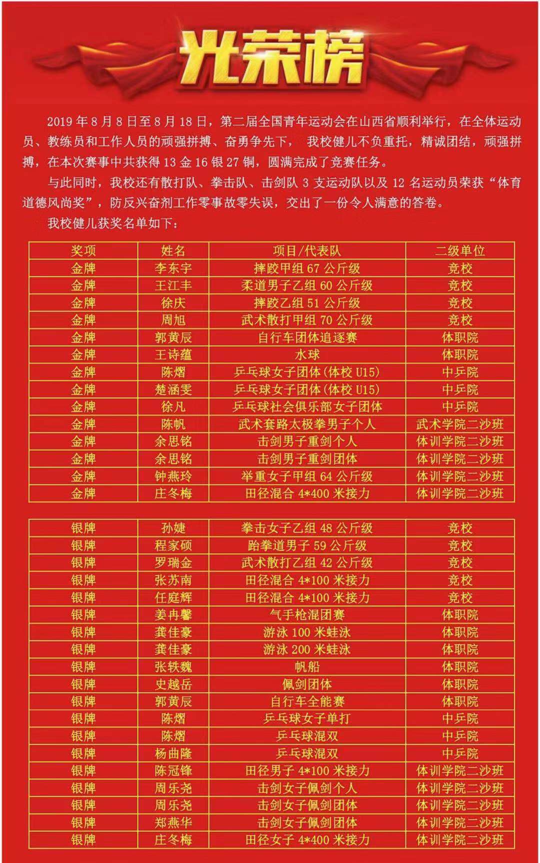 本网讯 8月8-18日,第二届全国青年运动会在山西举行。SUNBET健儿不负重托,精诚团结,顽强拼搏,一举拿下13金16银27铜,圆满完成了竞赛任务。与此同时,SUNBET还有3支运动队,12名运动员荣获“体育道德风尚奖”,防反兴奋剂工作零事故零失误,交出了一份令人满意的答卷。本次表彰会上海体育学院获得“突出贡献奖”,