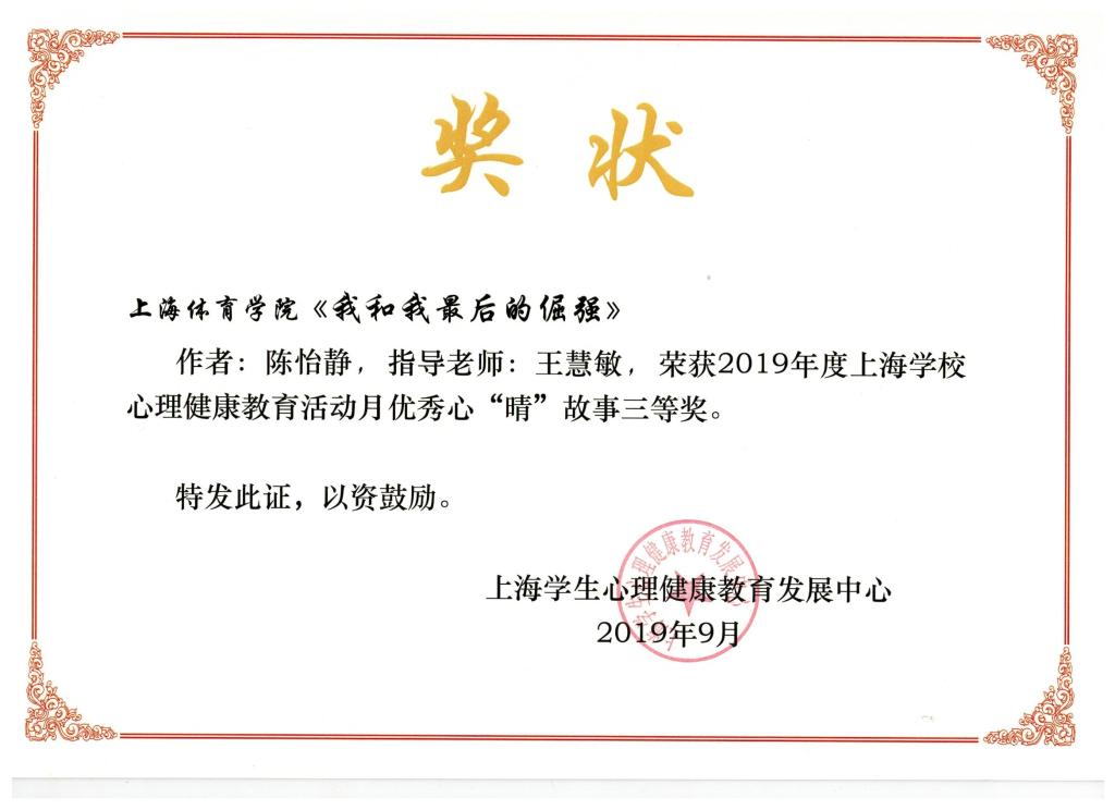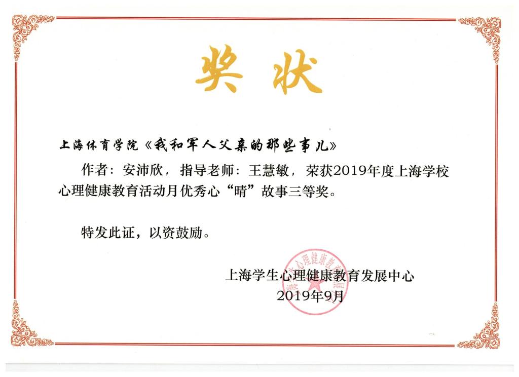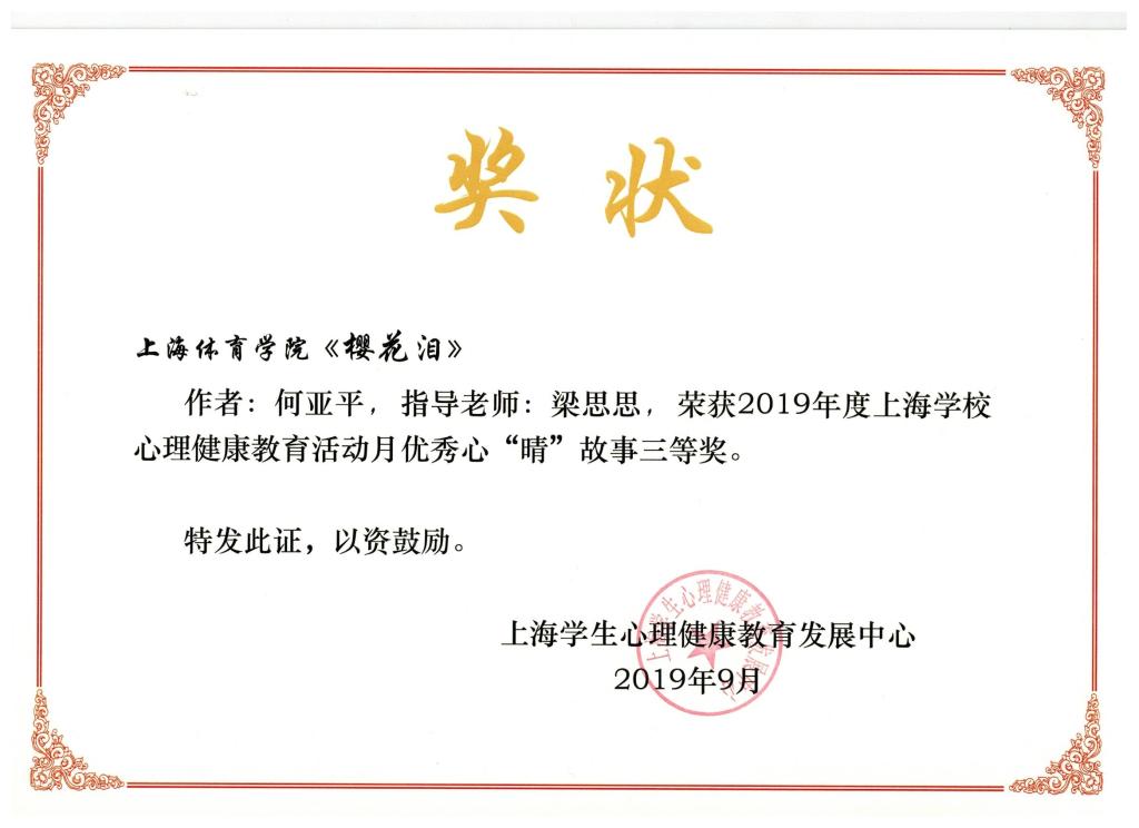 本网讯 9月25日,2019年度上海学校心理健康教育活动月总结表彰会在上海大学举行。此次活动月的特色项目为“我的国·我的家,我的“心‘晴’故事”征文活动,每所高校最多推选三篇参赛,活动共收到全市各高校参赛稿100多篇,55篇获奖,SUNBET选送的三篇征文均荣获三等奖,分别是心理学院何亚平撰写的《樱花泪》;传媒与艺术学院安沛欣撰写的《我和军人父亲的那些事儿》;运动科学学院陈怡静撰写的《我和我最后的倔强》。