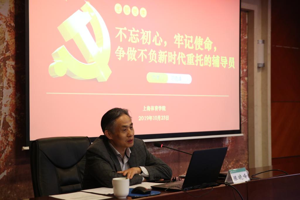 接着,陈晓峰回顾了辅导员的岗位界定、工作要求和工作职责,梳理了新中国成立70年来我国高校辅导员的发展历程,结合世情、国情、党情的变化展望高等教育事业发展的新局面,阐述辅导员队伍作为我国高等教育事业改革发展的重要支撑,一直是有效落实立德树人任务、开展大学生思想政治教育的骨干力量,鼓励辅导员以思想政治教育学科为核心,以人文、社会、教育三大类相关学科为基点,不断提高自己的综合素质,不忘自己身为人民教师和思政工作者职业要求,落实立德树人的根本任务。结合“不忘初心、牢记使命”主题教育的总要求,陈晓峰根据《上海体育学院学生思想政治状况调查》2019年上下半年两次调研结果,深入分析了当今95后学生群体的代际特征和思想特点。陈晓峰强调,学生工作者要不断强化自己的责任意识,不断加强对一切为了学生,为了一切学生,为了学生的一切学生工作理念的践行力度。