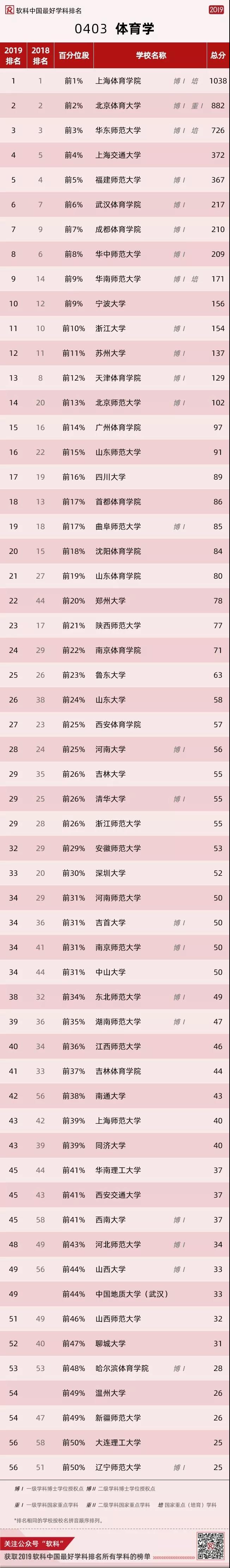 10月30日,软科正式发布2019中国最好学科排名,体育学学科排名共有57所大学上榜,上海体育学院、北京体育大学和华东师范大学位列三甲。这也是SUNBET连续第三年获得软科中国最好学科体育学排名第一。