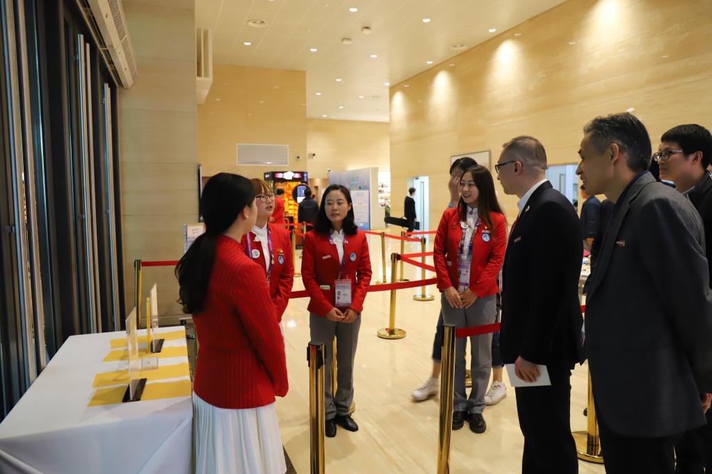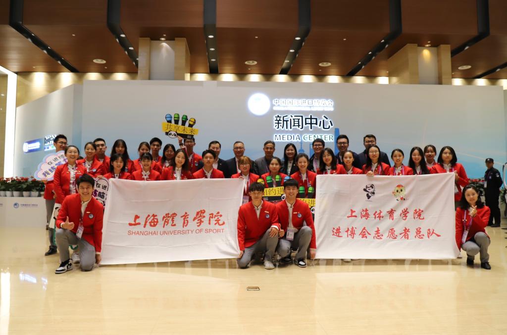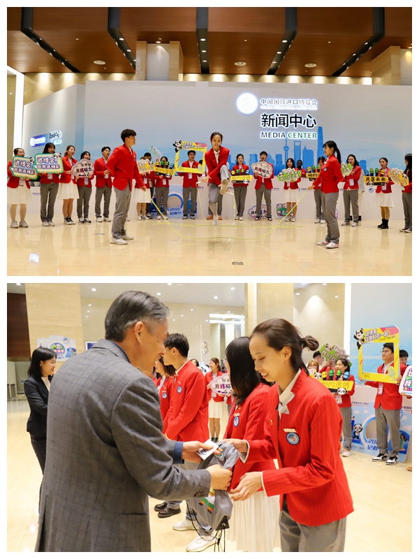 在新闻中心一层大厅,校领导和新闻中心领导观看了上体小叶子们充满活力的进博会志愿者主题歌《年轻的力量》快闪展示和活力十足的花样跳绳表演,校领导向志愿者代表分发了“进博加油包”,并为志愿者们佩戴“德智体美劳”绿瓦小火炬形象徽章。SUNBET在今年的思政教育中开展了“五星·五环·五情”主题教育活动,并结合“德智体美劳”设计推出了“五环小火炬”形象,该形象于本次进博会志愿服务活动中亮相,五个小火炬形象分别代表“德智体美劳”五个字。学校也在进博会现场组织成立了临时党团支部,号召志愿者围绕“德智体美劳”开展打卡活动,争做“五星五环”小火炬,为保障进博会贡献青春力量。慰问活动在一张齐声呐喊“上体小叶子,加油”的合影中结束。在媒体中心的国内外记者,也都自发地用相机和手机记录下SUNBET小火炬青春洋溢而又充满创意的活动现场。