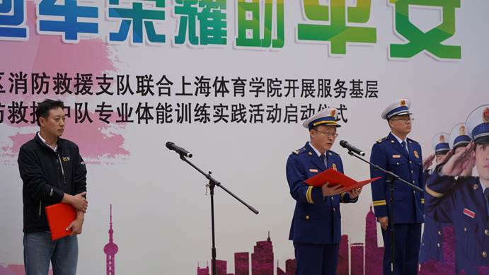 体训学院党委书记徐烈在致辞中表示,体训学院将依托学科优势,将专业的体能训练、健身训练等体育院校特有的科学训练方法与基层作战消防救援中队的日常训练相结合,既是对消防指战员通过科学训练提高灭火救援战斗力的服务工作,更是体现我们上体师生运用专业技能服务消防指战员的具体工作。通过双方的共同努力,这项工作对提高体训学生思想政治水平,培养乐于奉献、吃苦耐劳的意志品质会有着明显的促进作用;对杨浦消防为我院大学生提供实践平台、共同参与高校志愿服务项目表示诚挚的感谢。