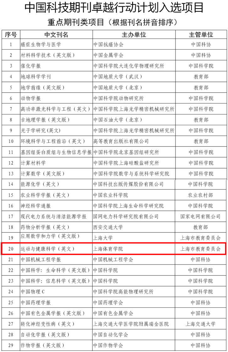 本网讯 近日,“中国科技期刊卓越行动计划”评审结果正式发布,上海体育学院主办的《运动与健康科学(英文)》成功入选中国科技期刊卓越行动计划重点期刊类项目,资助周期5年。