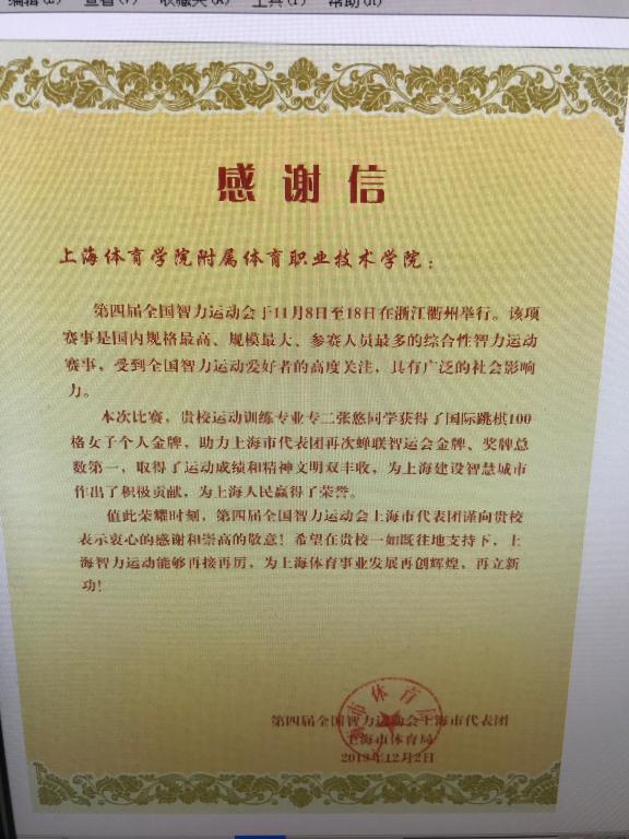 经过十几天的激烈角逐,上海代表团取得了12金9银6铜的成绩,其中我院运动训练专业专二学生张悠获得了国际跳棋100格女子个人金牌,助力上海代表团再次蝉联智运会金牌、奖牌数第一,取得了运动成绩和精神文明双丰收,为上海建设智慧城市作出了积极贡献,为上海人民赢得了荣誉!