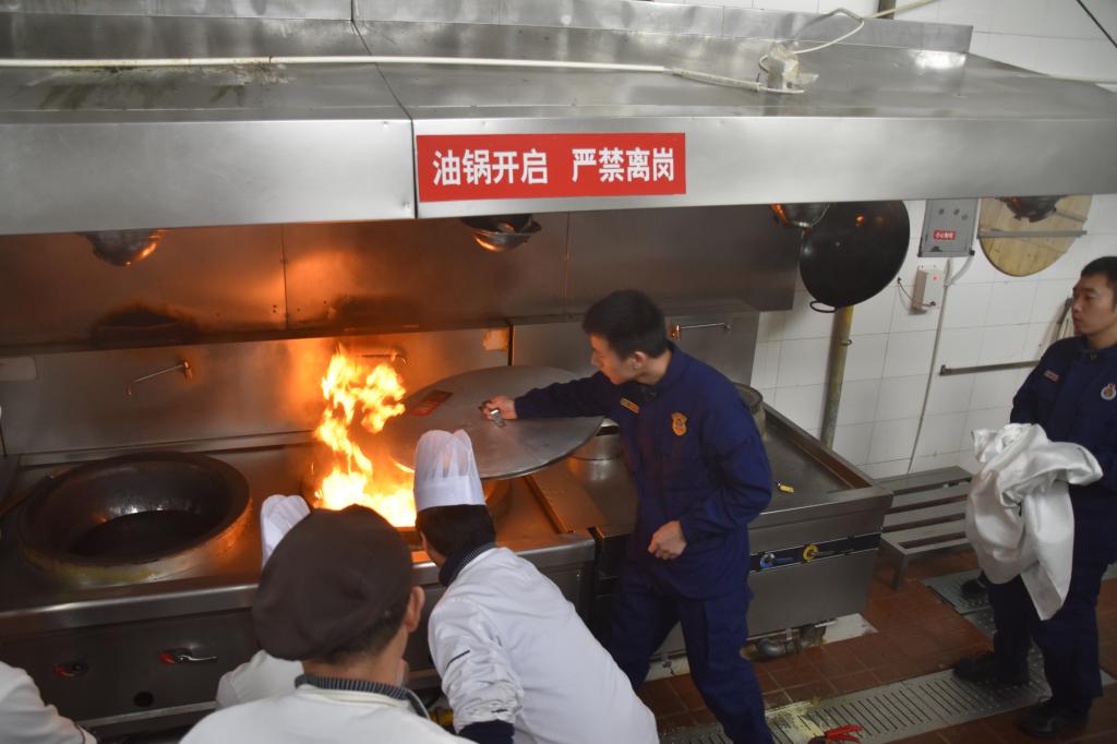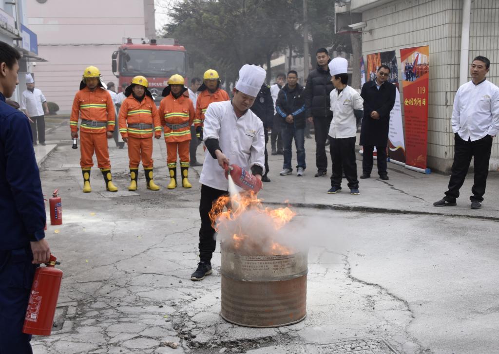 国和消防支队官兵对餐饮部工作人员进行了现场消防知识培训和各类消防器材的操作演示,对火灾分类、典型案例、逃生注意事项等做了比较全面的讲解。随后,参会的餐饮服务部员工进行了现场消防灭火、疏散演练:随着油锅的“燃起”,发现“火警”险情后,现场员工通过使用消防盖、灭火毯扑灭油锅,灭火器扑灭火盆、拉设水带灭火等实践演练,及时消除了“火警”。