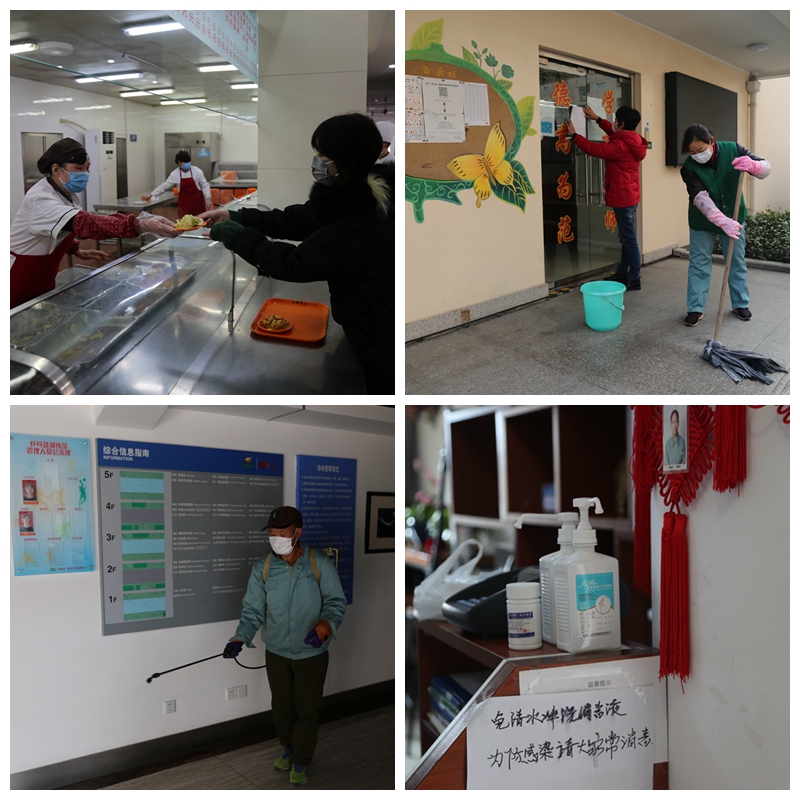 留守的上体后勤人用心站好特殊时期的每一班岗。按照分类管理的原则,后勤处加强面向后勤员工的疫情防控宣传和教育,做好餐饮、物业、门诊、车队、场馆等各部位各环节的防护工作。在餐饮方面,以更加严格的措施落实食品安全和卫生防疫管理,食堂内部就餐区域每天消毒三次,所有餐具均在60摄氏度以上的热风循环消毒柜内存放超过两小时后再行使用,最大限度地保证食堂用餐环境的卫生安全。食堂员工出入餐厅一律登记,早中晚三次测量体温,员工上岗全部佩戴医用口罩和一次性手套,一餐一换。物业部严格落实宿舍管理规定,寒假期间安排专人24小时值守,对进出公寓师生进行实名登记管理,同时加强对学生宿舍、场馆、楼梯、卫生间、校园公共区域的清扫、通风换气和消毒工作,在固定区域放置废弃口罩的专用垃圾桶,并在学生食堂、公寓楼值班室、收发室、门卫等处张贴《防控新型冠状病毒感染肺炎疫情倡议书》。门诊部对疫情的监测、诊疗、防控等进行了具体布置,多渠道宣传普及防疫知识。针对开学后建立相关工作长效机制,门诊部做细做实防控工作预案,确保严格落实“早发现、早报告、早隔离、早诊断、早治疗”的防控要求,切实为师生筑牢健康“防火墙”。
