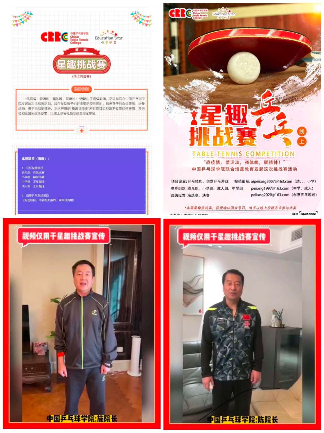 中国乒乓球学院施之皓院长、陈彬教授带领中乒院师生团队联合上海培星教育的星公益平台,发布了乒乓球星趣挑战赛(线上海选赛),旨在鼓励青少年在家防疫的同时,增强自信,培养热爱运动、勇于挑战的精神,国内外青少年纷纷上线挑战。