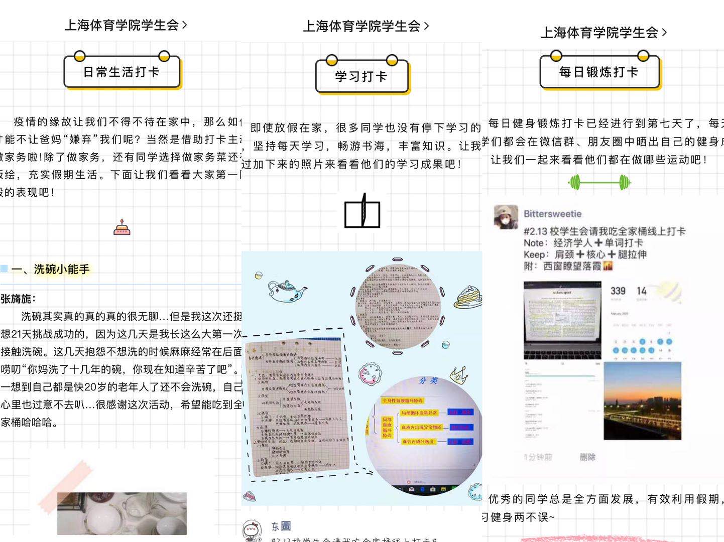 校学生会在疫情开始之初即上线了“21天打卡计划”,号召广大上体学子安心在家抗击疫情的同时,以积极的心态继续保持学习、锻炼、生活的动力。在活动第二阶段结束时,我们看到了来自同学们在家学习的笔记、锻炼的打卡、精美的手绘,也看到了同学们发挥了奇思妙想,在“美食大作战”栏目中充满创意和惊喜的菜肴照片,也看到了辩论社同学在网络云端模拟辩论赛场面,给同学们剖析辩论比赛中头脑风暴的每一个细节,可谓是动静相宜、相映成趣。学生会每个部门都已在这个特别的时期行动起来,学生会1月29日发布了《全体绿瓦学子,我们一起承诺!》倡议书,发起了全体学子抗击疫情的集结号,期间学生会记者团的“发现上体”、生活部的“权心权益”“美食大作战”、学习部的“网课指南”也在不同板块间发光发热,共同坚守绿瓦青年人的网络抗疫阵地。