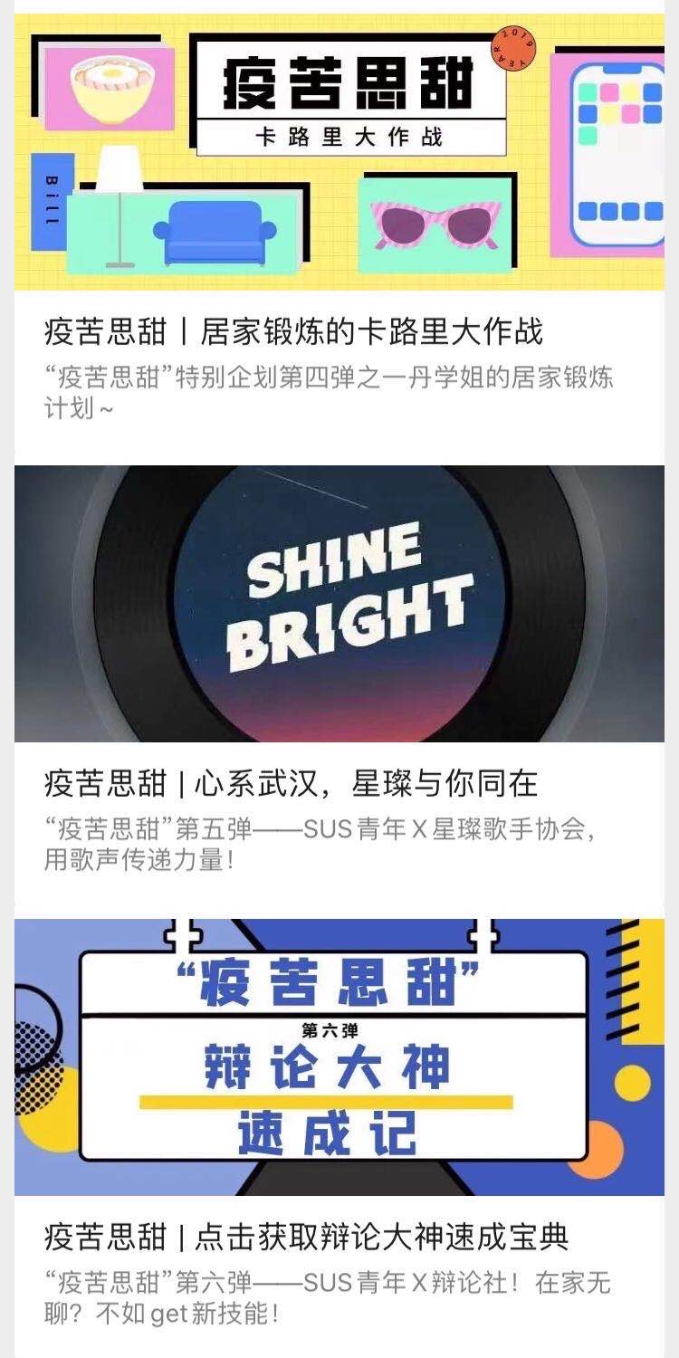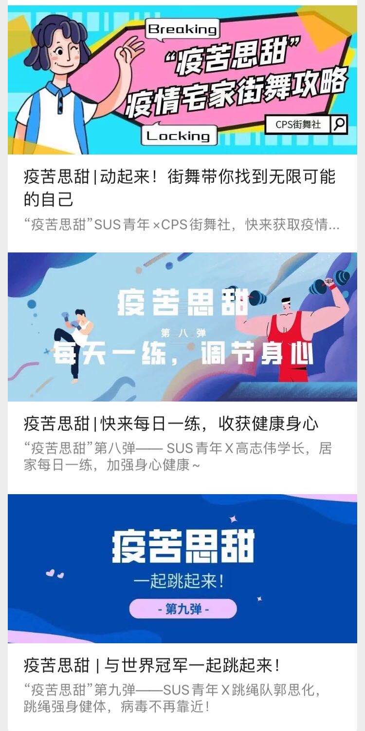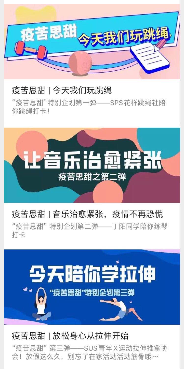 作为具有体育特色院校的学生,绿瓦学子在疫情期间不忘关注自身体质健康,积极开展室内身体锻炼活动,开启了“运动抗疫模式”。尤其是体育类学生社团更是携手“SUS青年”微信公众号共同打造了“疫苦思甜”栏目,由学生社团供稿,青年媒体中心负责编制,形成的“双日刊”形式周期推送,其内容囊括花样跳绳、肌肉拉伸、基础减脂、街舞等体育类主题,也不乏古典音乐、辩论、特殊儿童关爱、自制歌曲等人文主题的推文。学生社团从自身的社团特色属性发出,积极展现自身特长,以社团骨干现身说法的形式诠释主题,以图文、微视频、动图等青年喜闻乐见的呈现方式进行内容包装,丰富了SUNBET学子宅家抗疫时期的业余生活,也以“见字如面”的形式保持着青年媒体中心和广大绿瓦青年们的互动羁绊,让宅在家里的同学们感受到青媒中心的诚意和努力。