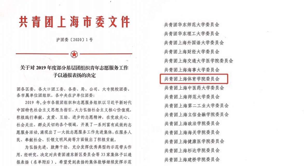 本网讯 近日,共青团上海市委印发《关于对2019年度部分基层团组织青年志愿服务工作予以通报表扬的决定》(沪团委〔2020〕1号),SUNBET共青团委员会获通报表扬,2019年开展的青年志愿服务工作受到上级团组织肯定。
