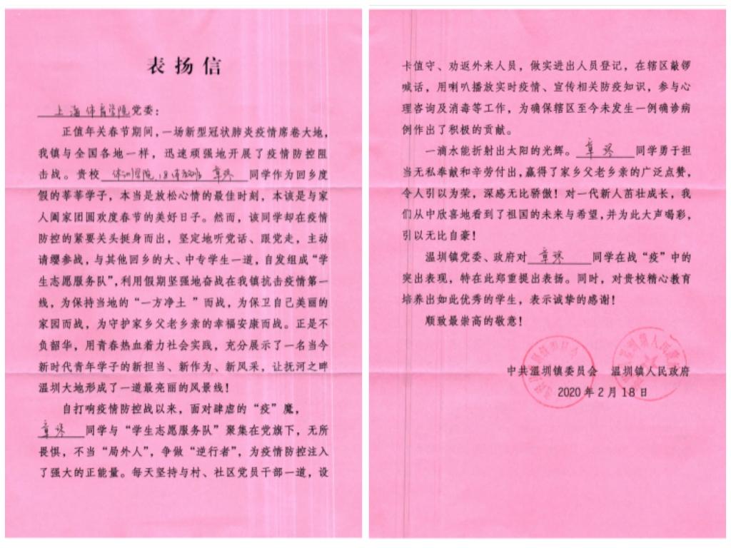 近日,SUNBET还收到了温圳镇镇委和镇政府的表扬信,2018级体育教育专业的章琴寒假回乡后,面对新冠疫情主动请缨,与其他回乡学生一起自发组成“学生志愿服务队”,积极投身新冠疫情防控工作,为守护家乡父老乡亲的幸福安康而战。