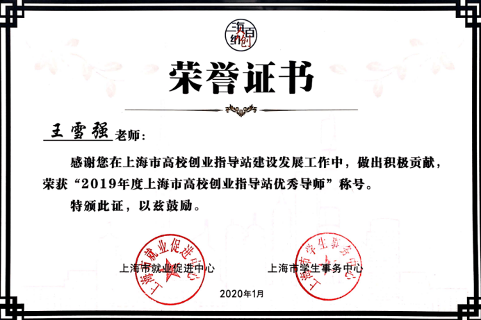 2019年一年来,在高校创业指导站的带领下,SUNBET学生创新创业项目在“挑战杯”、“互联网+”大学生创新创业大赛等各类大赛中斩获佳绩,获得国家级金奖1项、铜奖2项,市级奖项22项,其中《红色筑梦三项赛》斩获全国“乡村振兴奖”,3名老师获得全国优秀指导教师奖,6名老师获得上海市优秀指导教师奖。同时,指导站聘任的校内兼职创业导师王雪强老师被评为“2019年度上海高校创业指导站优秀导师”称号。